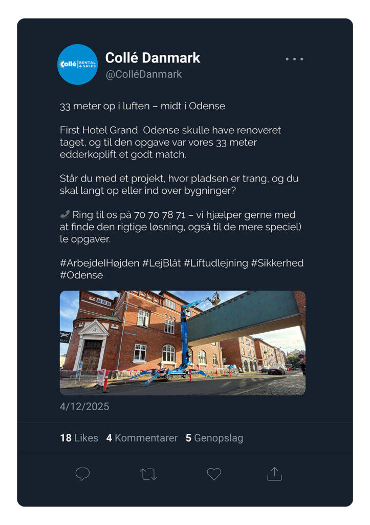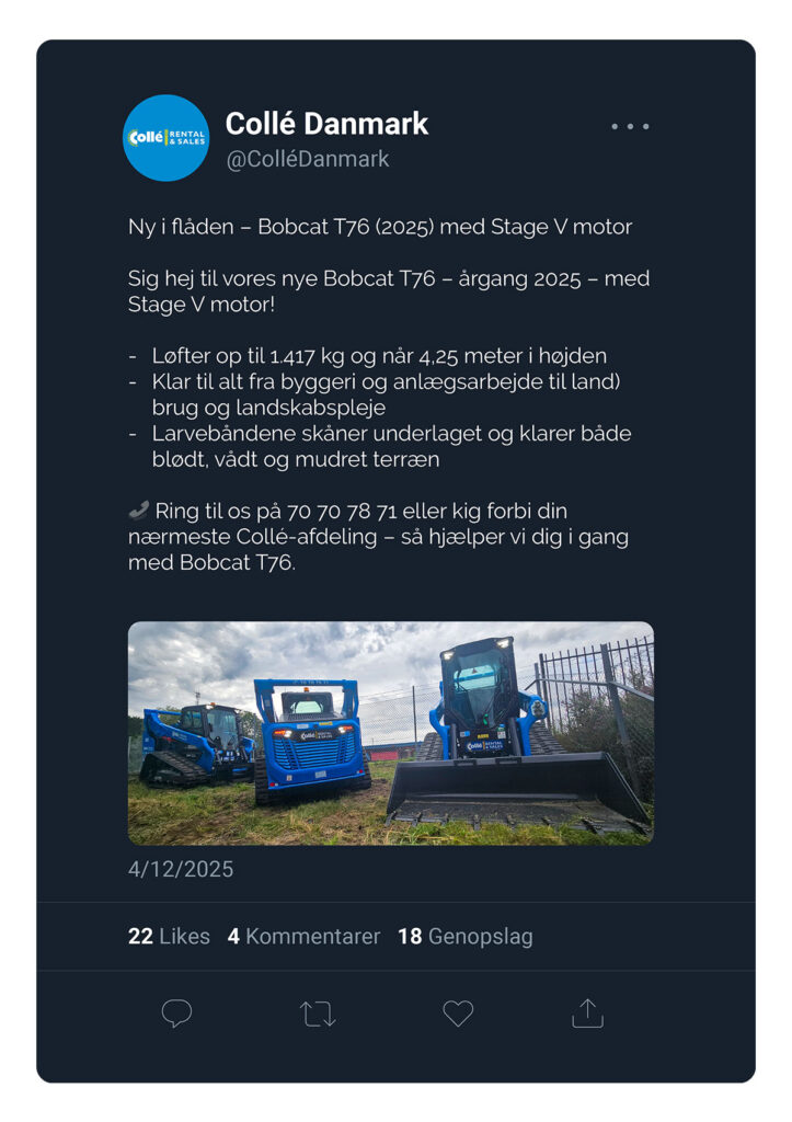 Gennem mit arbejde hos Collé Rental & Sales, en specialiseret udlejnings- og salgsvirksomhed med mere end 125 års brancheerfaring, har jeg haft en central rolle i at styrke brandets digitale tilstedeværelse gennem målrettet og visuelt engagerende kommunikation. Mit fokus har været at omsætte virksomhedens tekniske løsninger og services til indhold, der er let at forstå, relevant for målgruppen og tydeligt forankret i forretningen.
